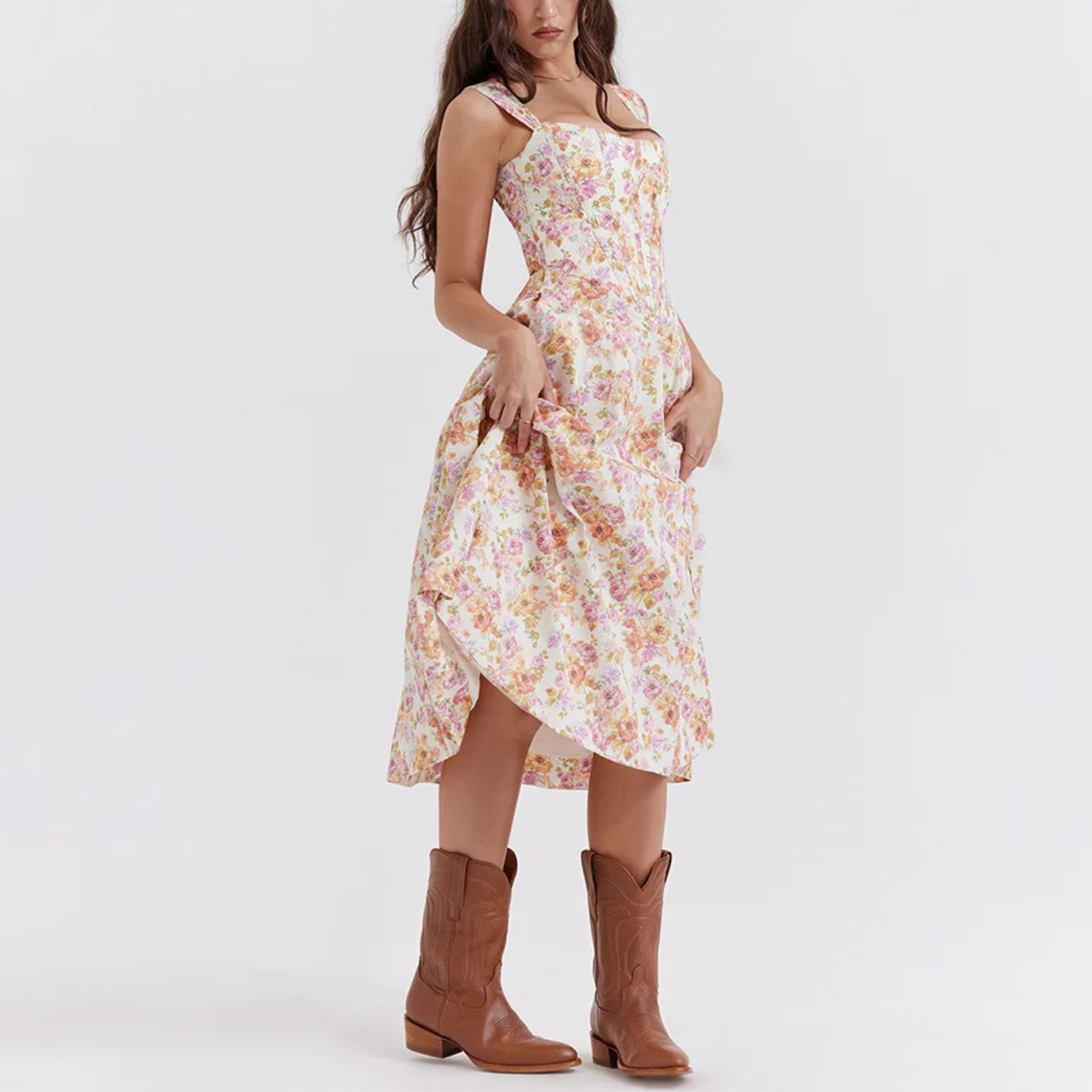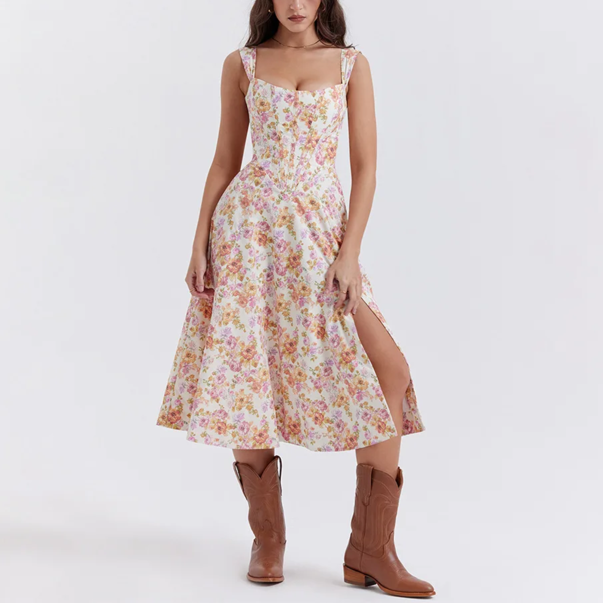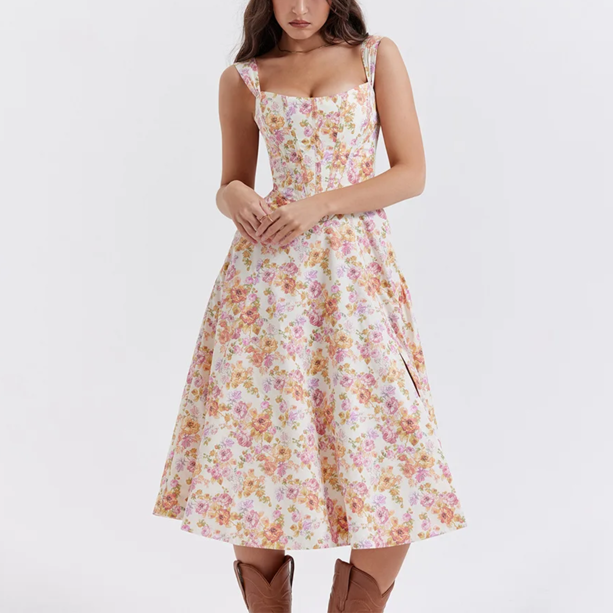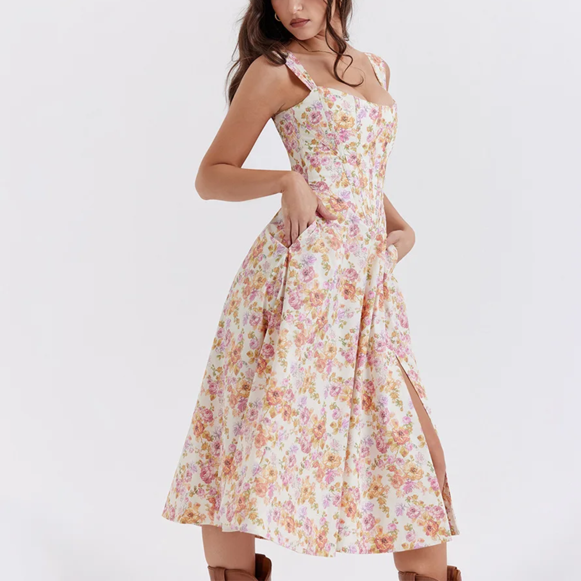 Make a statement with our Floral Print A-Line Midi Dress, designed for those who love a touch of romance and elegance. The lace-up back detail adds an intricate flair, while the corset-style bodice creates a beautiful, feminine shape. With a stylish front split, this dress ensures you move effortlessly through any occasion. Perfect for a day in the park or a sophisticated soirée, it combines charm and grace seamlessly.