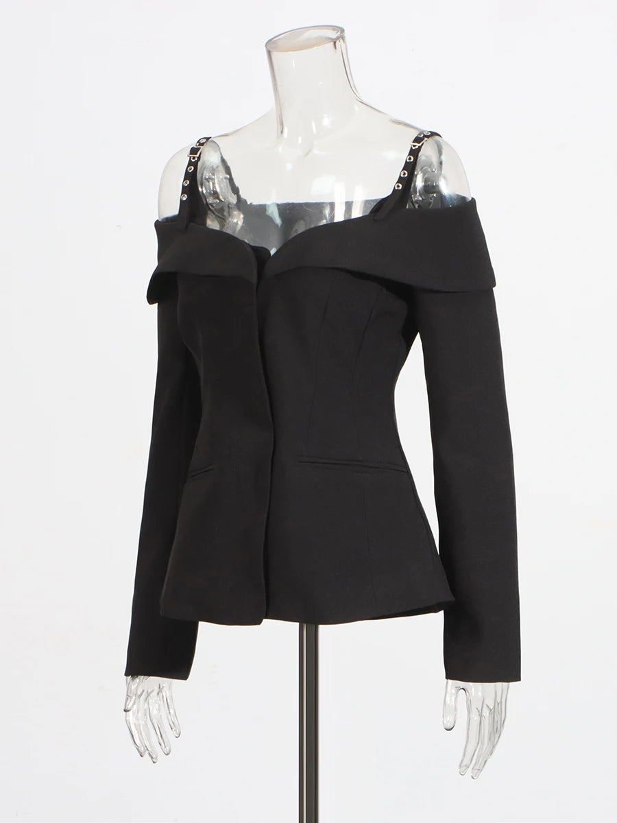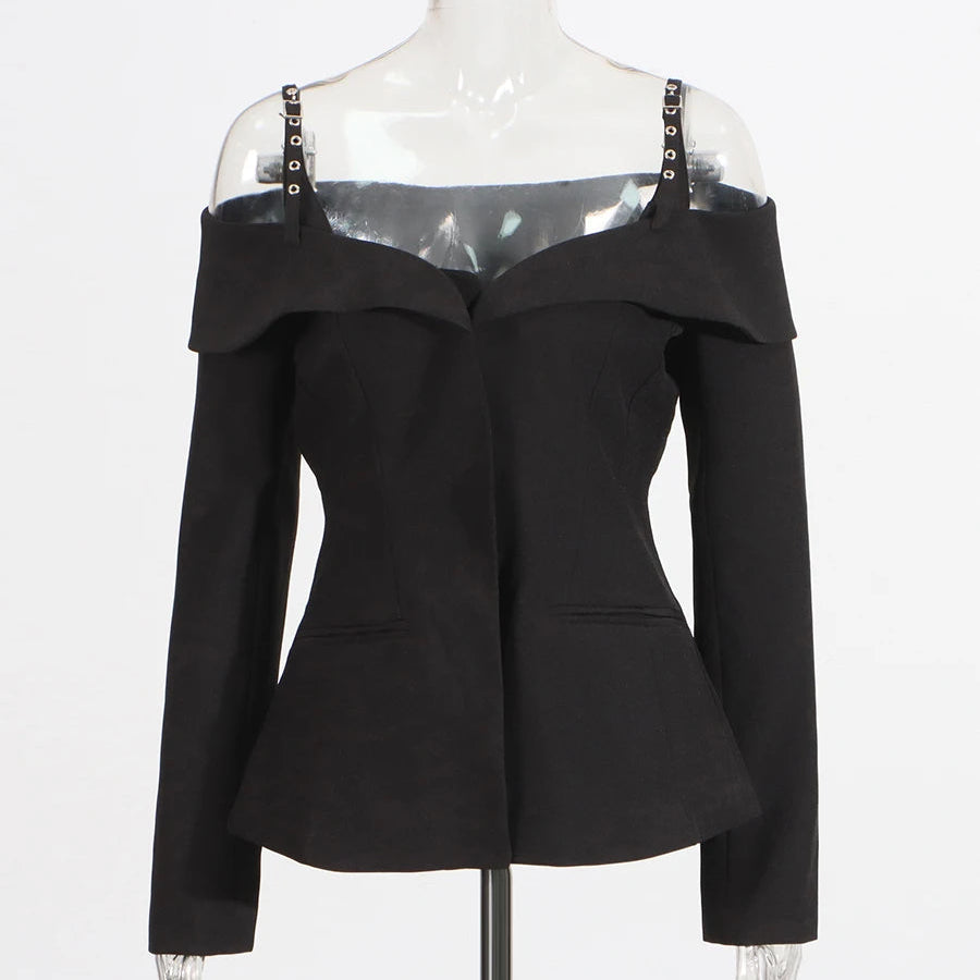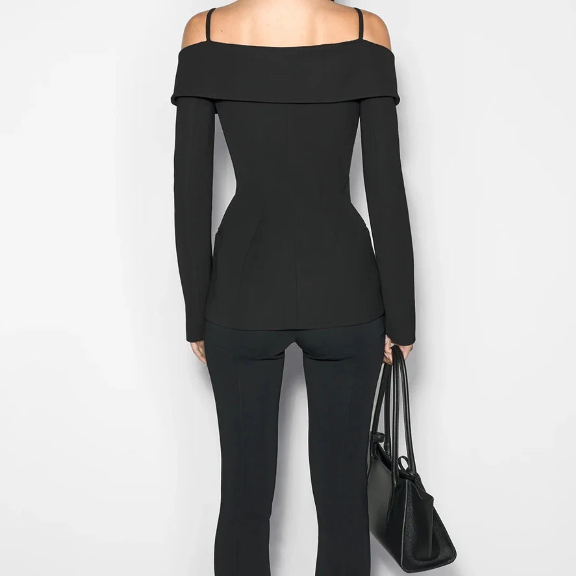 Sleek, confident, and effortlessly sultry — the Valentina Top brings a modern twist to classic tailoring. Designed with an off-shoulder neckline and delicate strap detailing, it contours the body with precision for a sculpted, high-fashion silhouette. Whether styled with tailored trousers or a chic mini skirt, this piece commands attention from every angle.