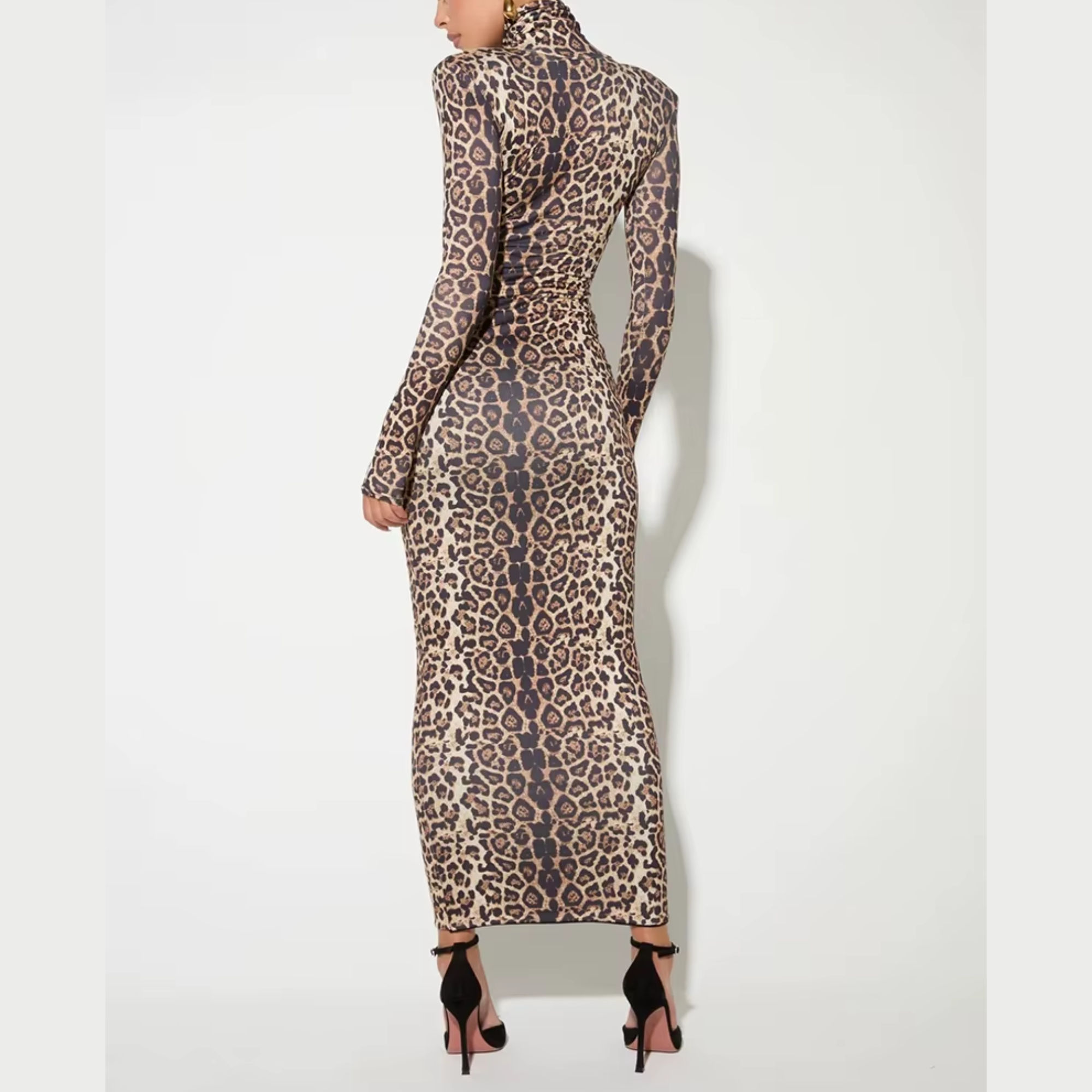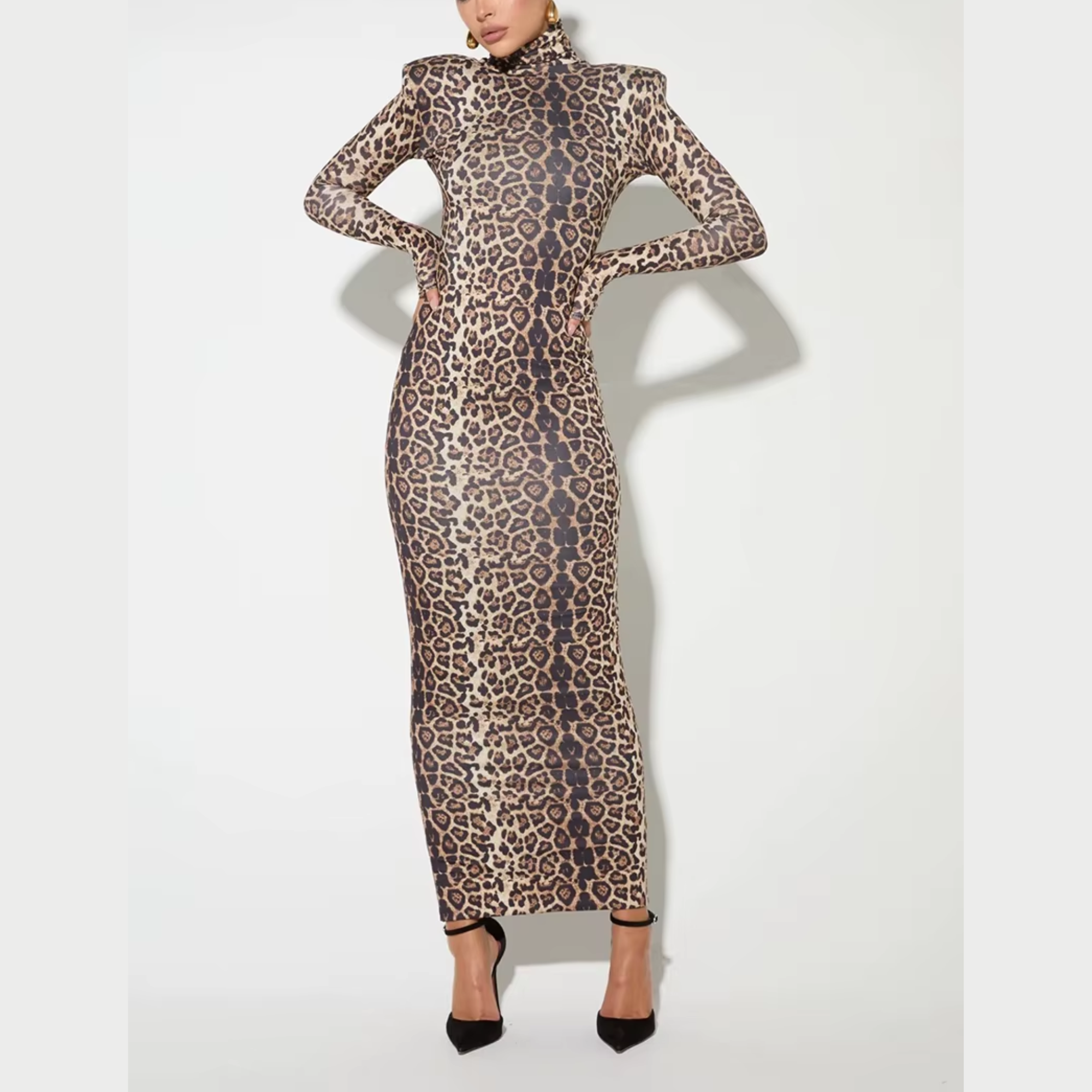 Våga vara annorlunda i denna fantastiska leopardmönstrade maxiklänning med polotröja och bodycon. Tillverkad av högkvalitativt tyg erbjuder denna klänning både komfort och stil. Leopardmönstret ger en touch av vildhet, medan polotröjan ger den en elegant look. Maxilängden tillför ett element av elegans, och den bodycon-passformen framhäver din figur vackert. Detta mångsidiga plagg är perfekt för middagar, dejter eller till och med exklusiva sociala evenemang. Klä upp det med accessoarer eller håll det enkelt – oavsett vilket kommer du att se fantastisk ut.