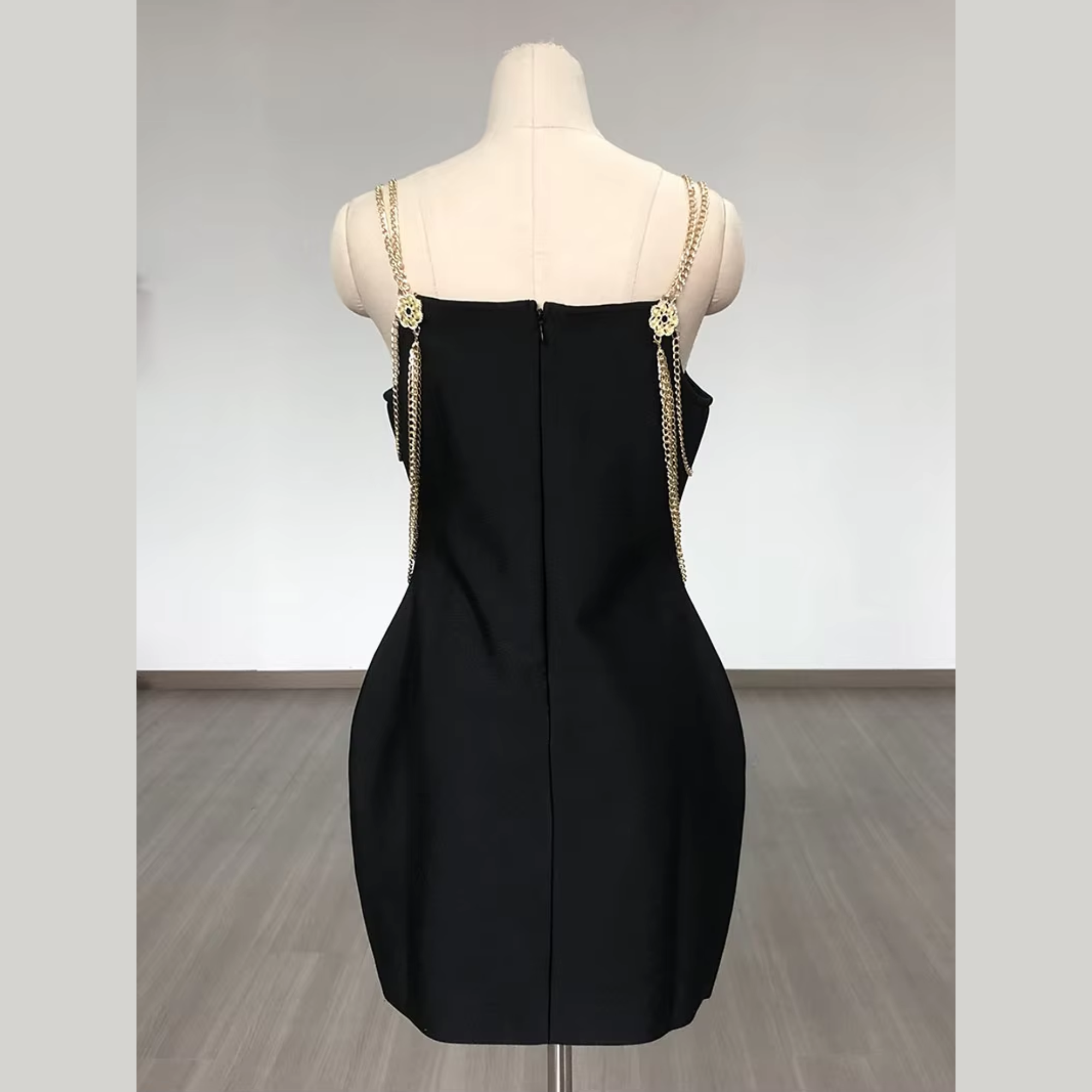 Dra uppmärksamhet till dig vid alla tillfällen med denna fantastiska svarta mini-bandageklänning i plusstorlek. Med guldfärgade utsmyckningar och snygga kedjedetaljer på axelbanden och kroppen är denna klänning designad för att göra ett uttalande. Tillverkad av ett högkvalitativt bandagetyg följer den dina kurvor på alla rätt ställen samtidigt som den ger gott om stöd. Perfekt för en utekväll eller ett speciellt tillfälle, kombinerar denna klänning sofistikering med en touch av glamour. Kliv in i rampljuset med självförtroende och stil i detta oumbärliga tillskott till din garderob.