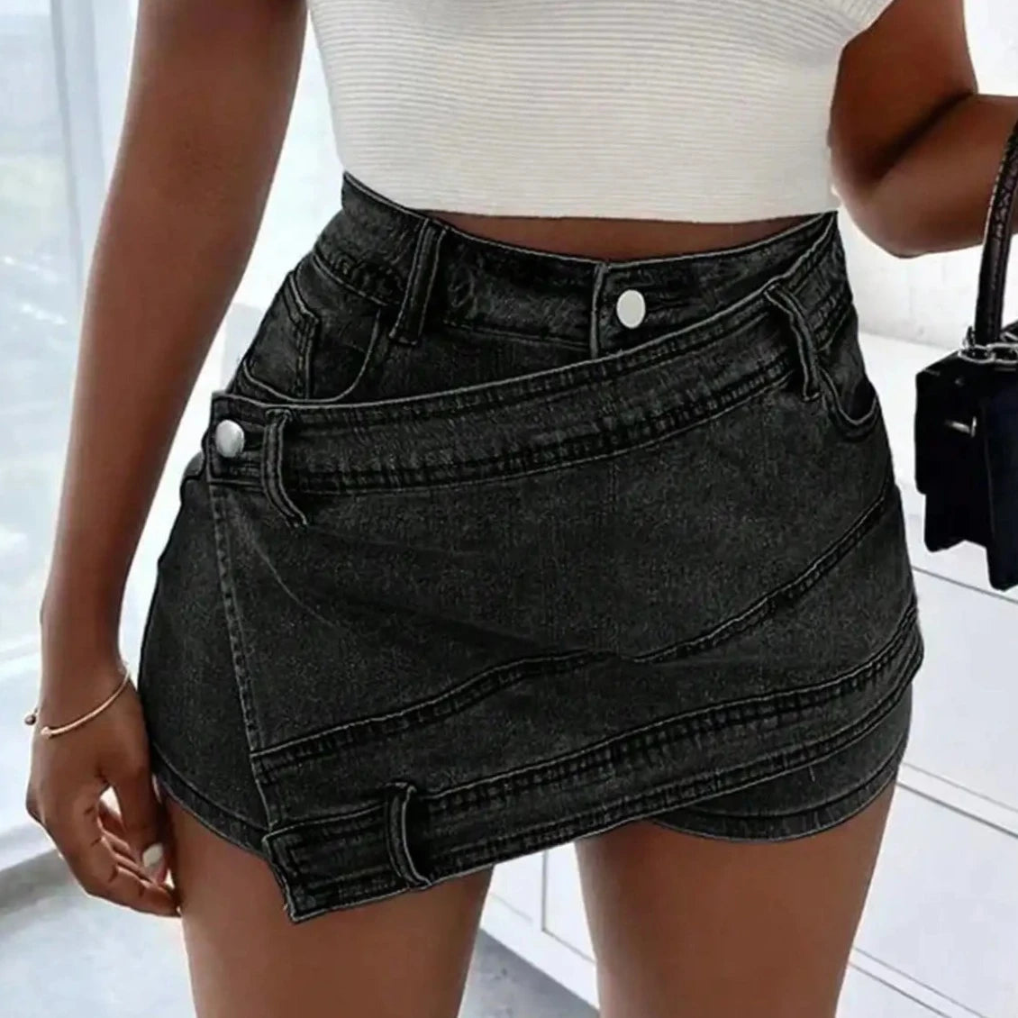 Förvandla din sommarlook med dessa snygga, asymmetriska mini-jeanshorts i omlottmodell. De ger en unik, modern känsla till den tidlösa mini-shortsdesignen. Den omlottliknande midjan skapar en unik visuell effekt som säkerställer att dessa inte bara är vanliga jeansshorts. De är en het favorit bland trendsättare och matcha med vilken outfit som helst för att förbättra din stil utan ansträngning.