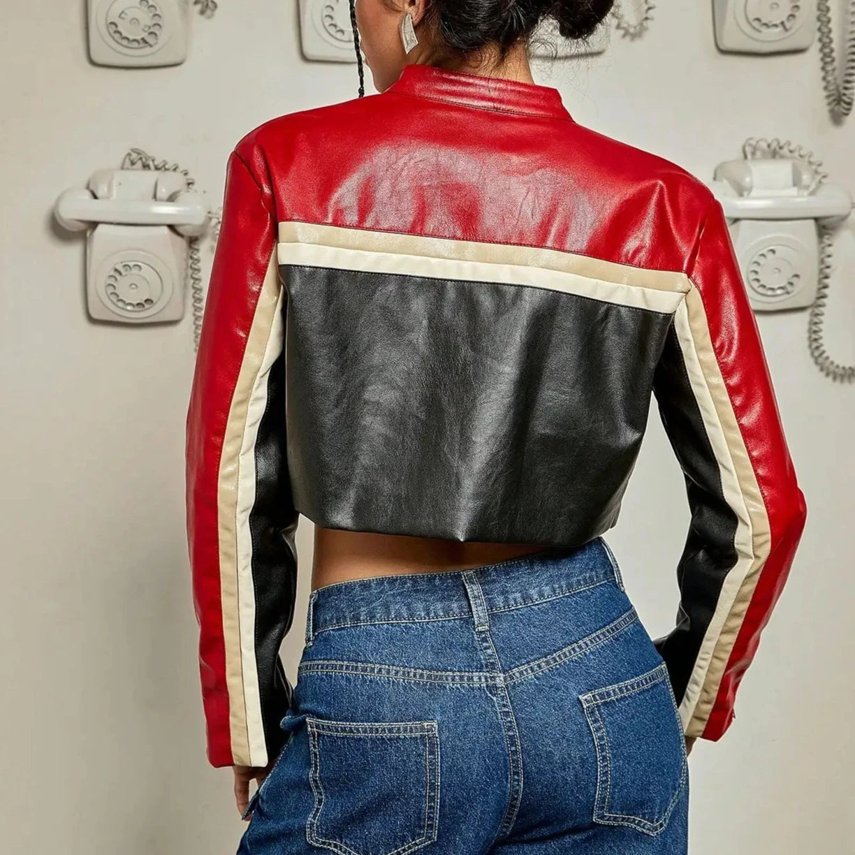 Gör ett tufft modeuttalande med vår beskurna bikerjacka i konstläder i svarta och röda färgblock. Med nitar som pryder bröstet utstrålar denna jacka självförtroende och stil. Tillverkad av slitstarkt och cruelty-free konstläder lovar den lång hållbarhet och stil. Oavsett om du är ute på gatorna eller på konsert, ger denna jacka den perfekta touchen av rebellisk stil till vilken outfit som helst. Mångsidig och djärv, ett måste för den moderna fashionistan.
