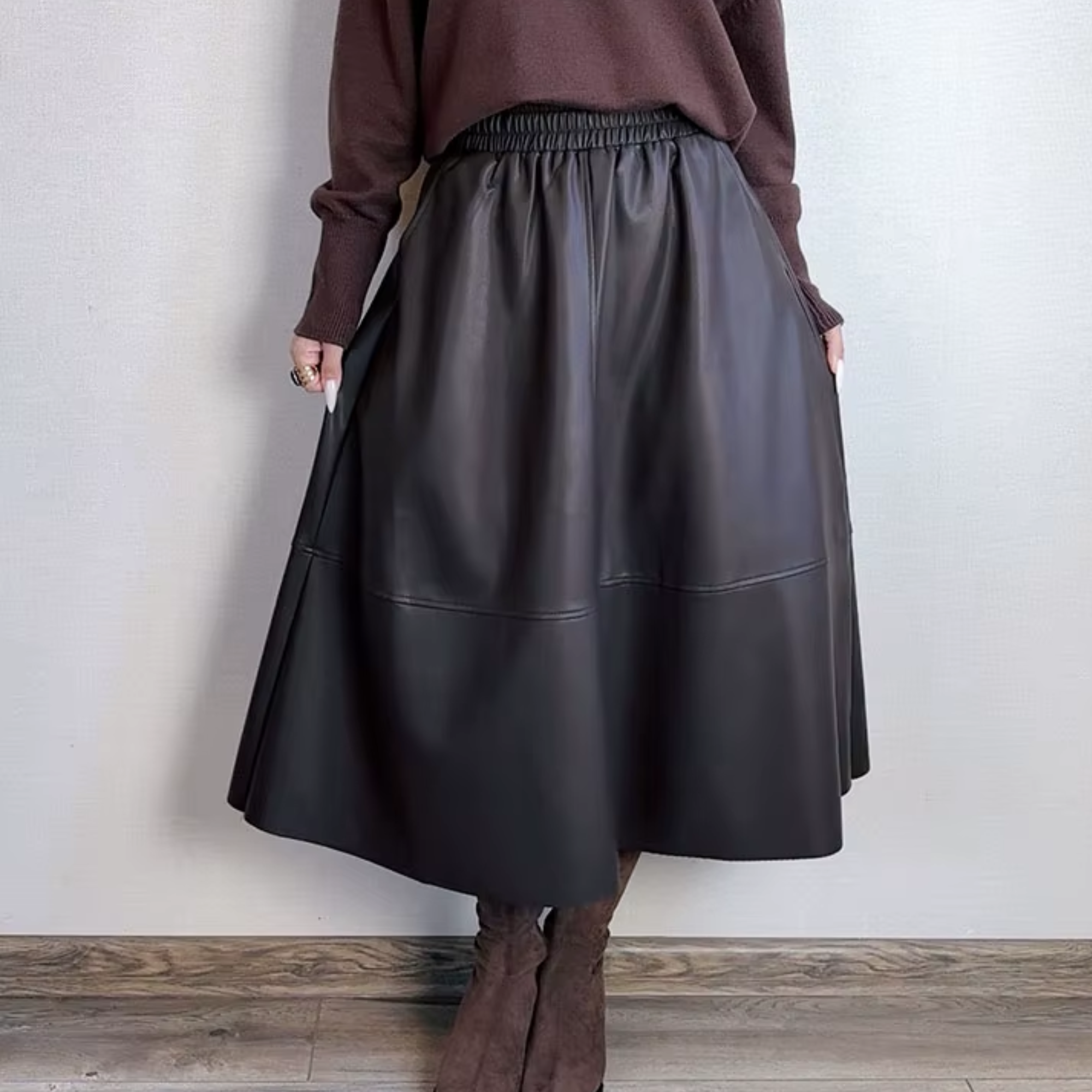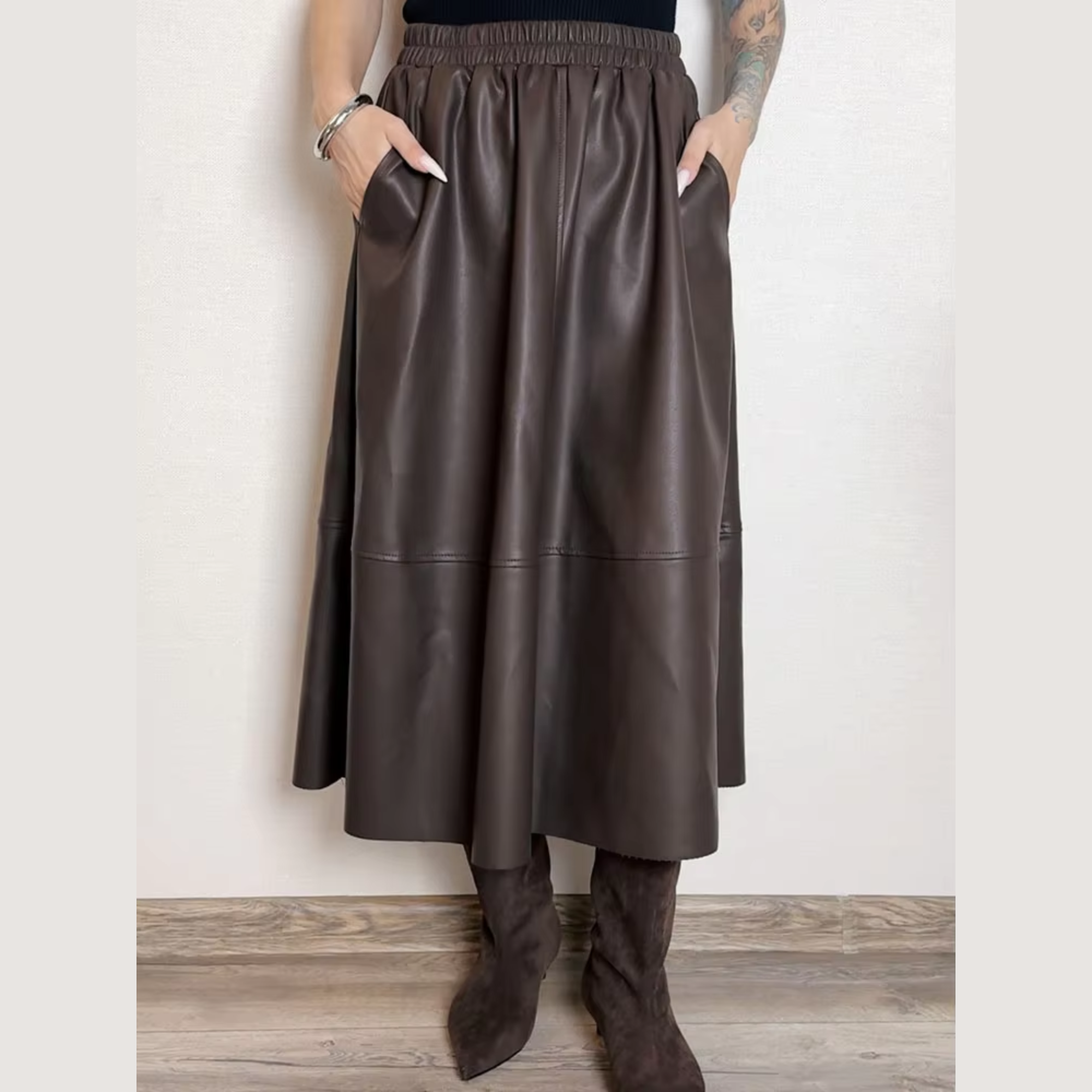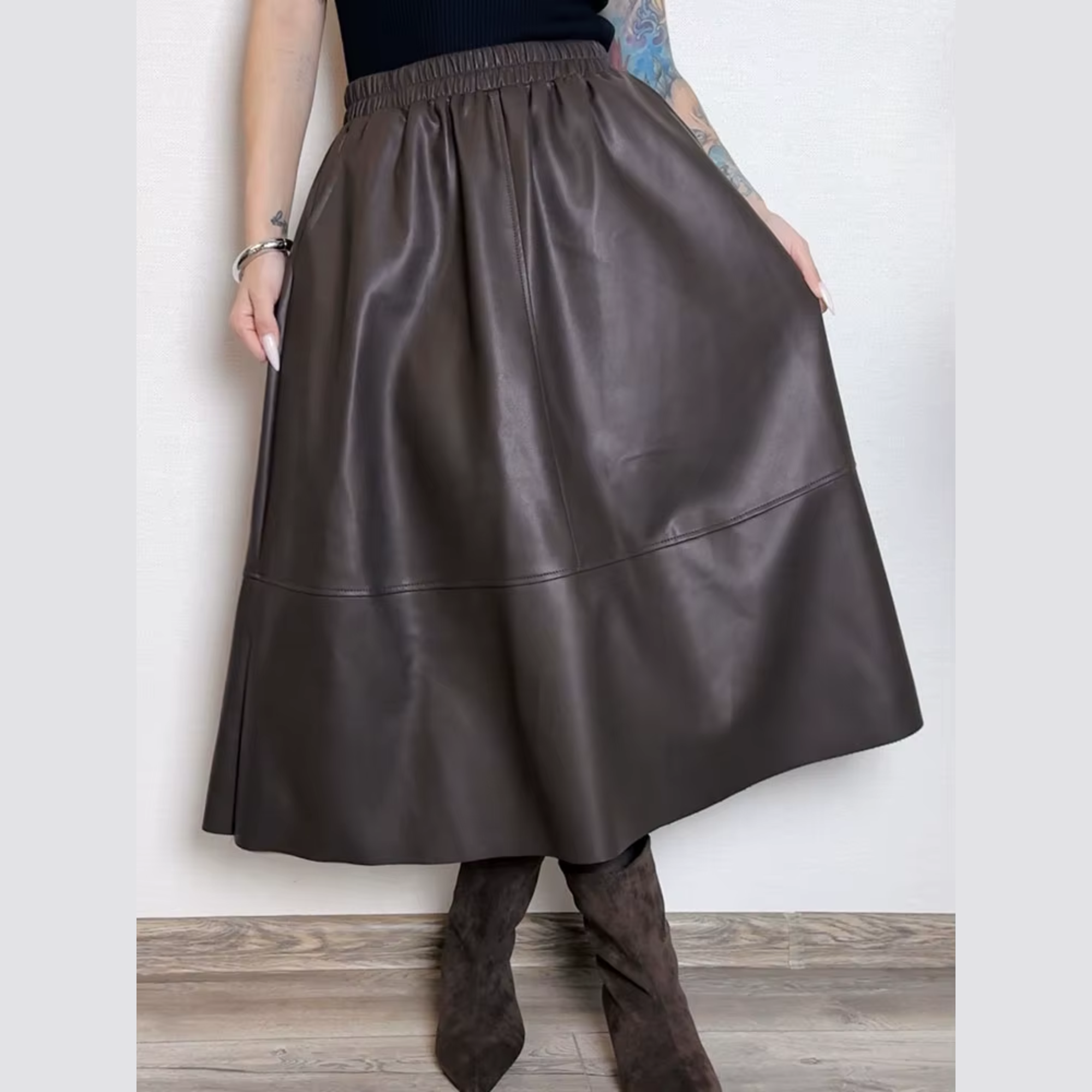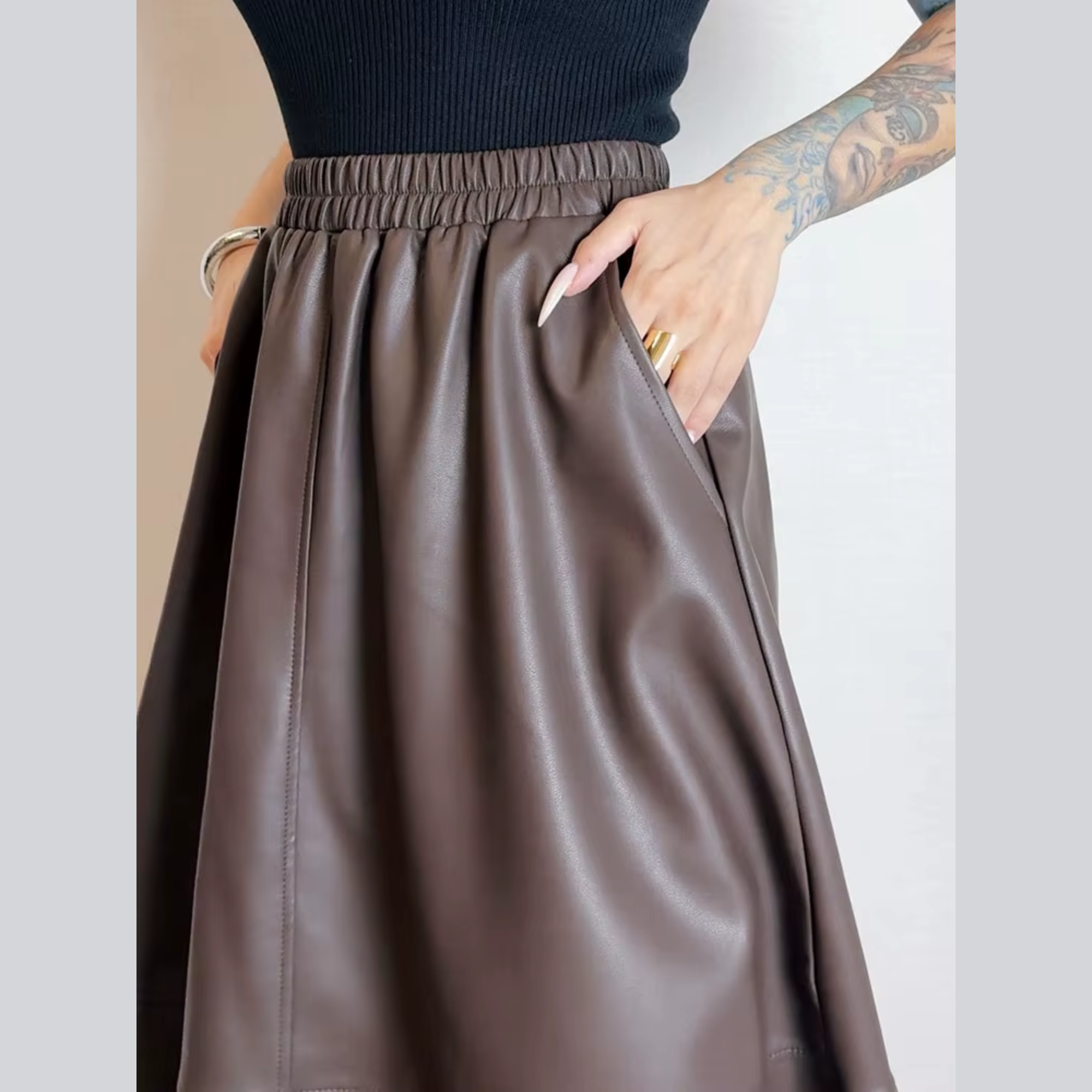 Uppgradera din modeupplevelse med denna trendiga midikjol i konstläder med resår i midjan och a-linjeform. Den är tillverkad för moderna kvinnor och erbjuder en elegant a-linjeformad skärning som framhäver vilken figur som helst. Den resåriga midjan garanterar en bekväm passform, medan midilängden är både elegant och mångsidig. Perfekt för kontorskläder eller en utekväll, denna kjol har praktiska fickor för extra bekvämlighet. Matcha den med dina favorittoppar och accessoarer för en elegant och trendig ensemble.