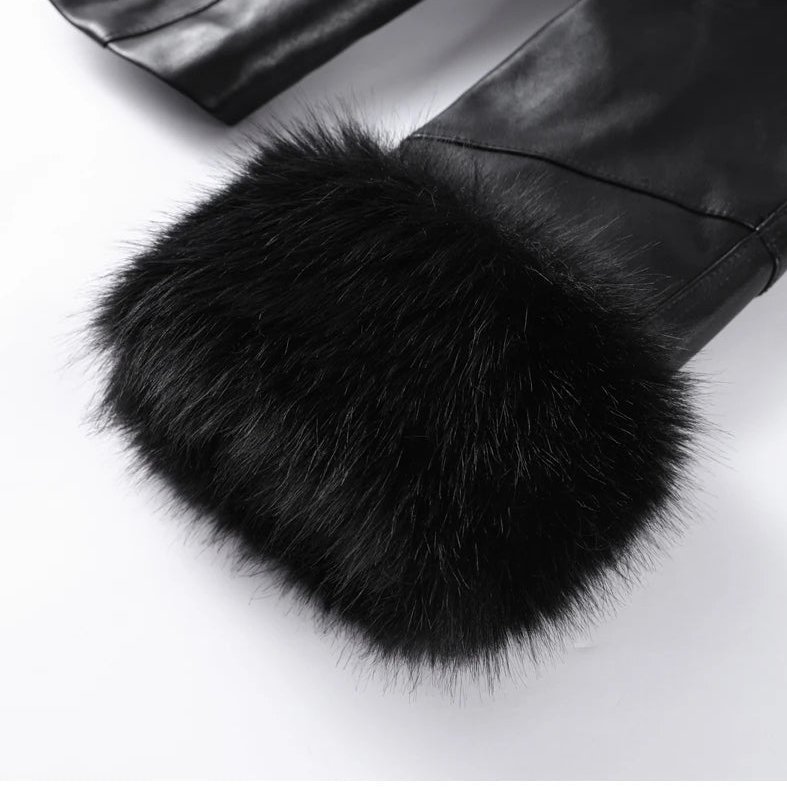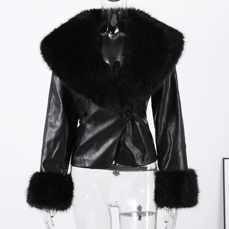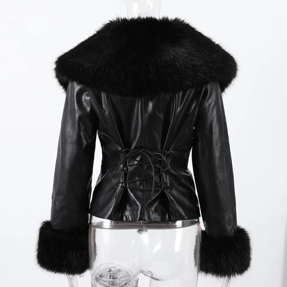 Step into bold sophistication with Salice, a statement jacket designed for women who love dramatic elegance. Crafted with a sleek faux-leather finish and trimmed in plush, voluminous faux fur, this piece brings runway energy to any look. The structured silhouette, lace-up back detailing, and oversized fur collar make Salice the perfect blend of luxury and edge. Whether styled for dinner, date night, or a winter night out—she’s guaranteed to turn heads.