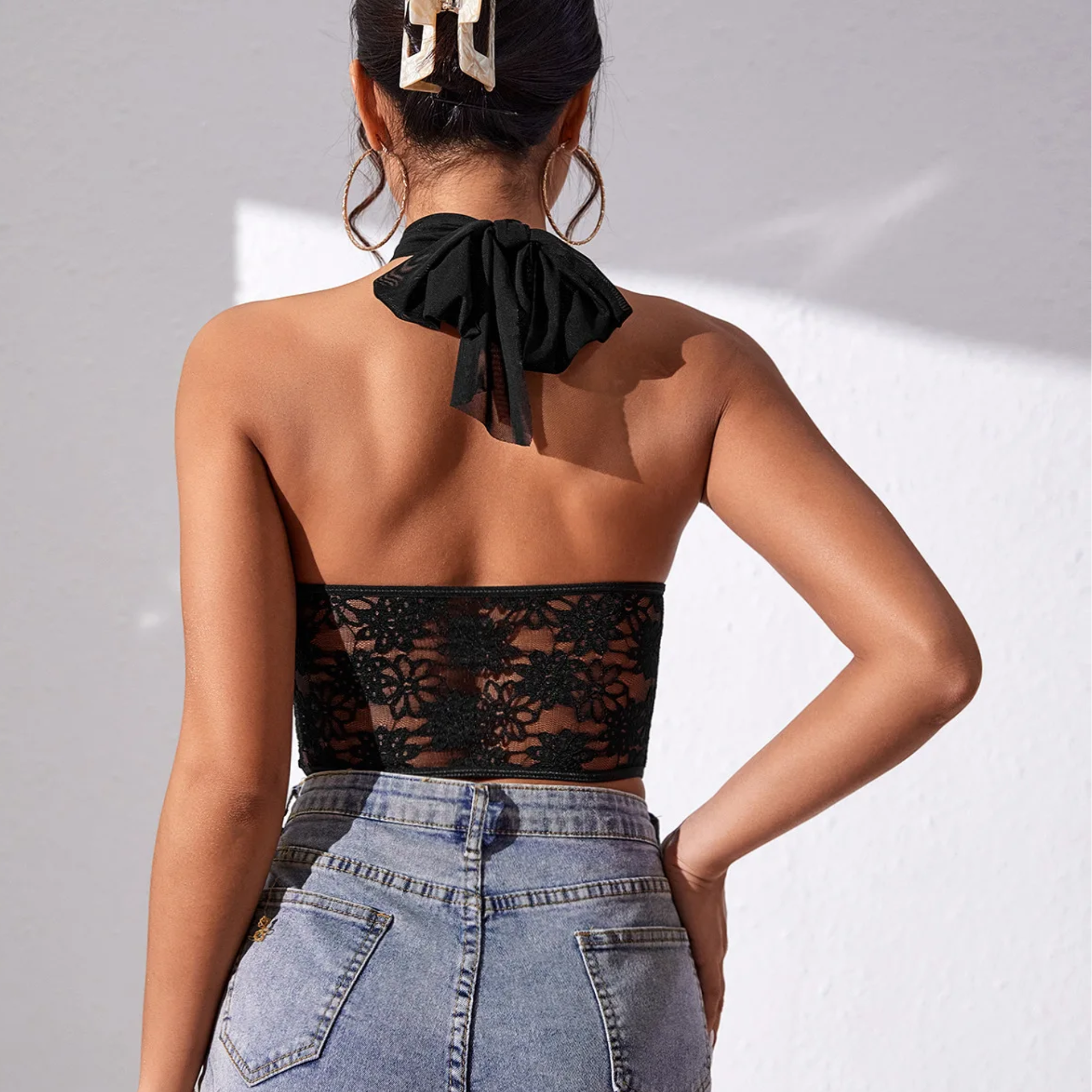 Vår fantastiska halterneck-top med spetsmönster och kors i spets är designad för självsäkra, moderna kvinnor. Toppen förenar tidlösa modeelement med sina spetsdetaljer i mesh, korsmönster framtill och halterneck-utskärning. Den korsettinspirerade midjedetaljen framhäver elegant din naturliga form och ger en touch av feminin charm. Denna topp lovar en ensemble som lämnar ett bestående intryck, oavsett om det är för en cocktailparty eller en middagsdejt. Uppgradera din garderob med denna sofistikerade basklass idag!