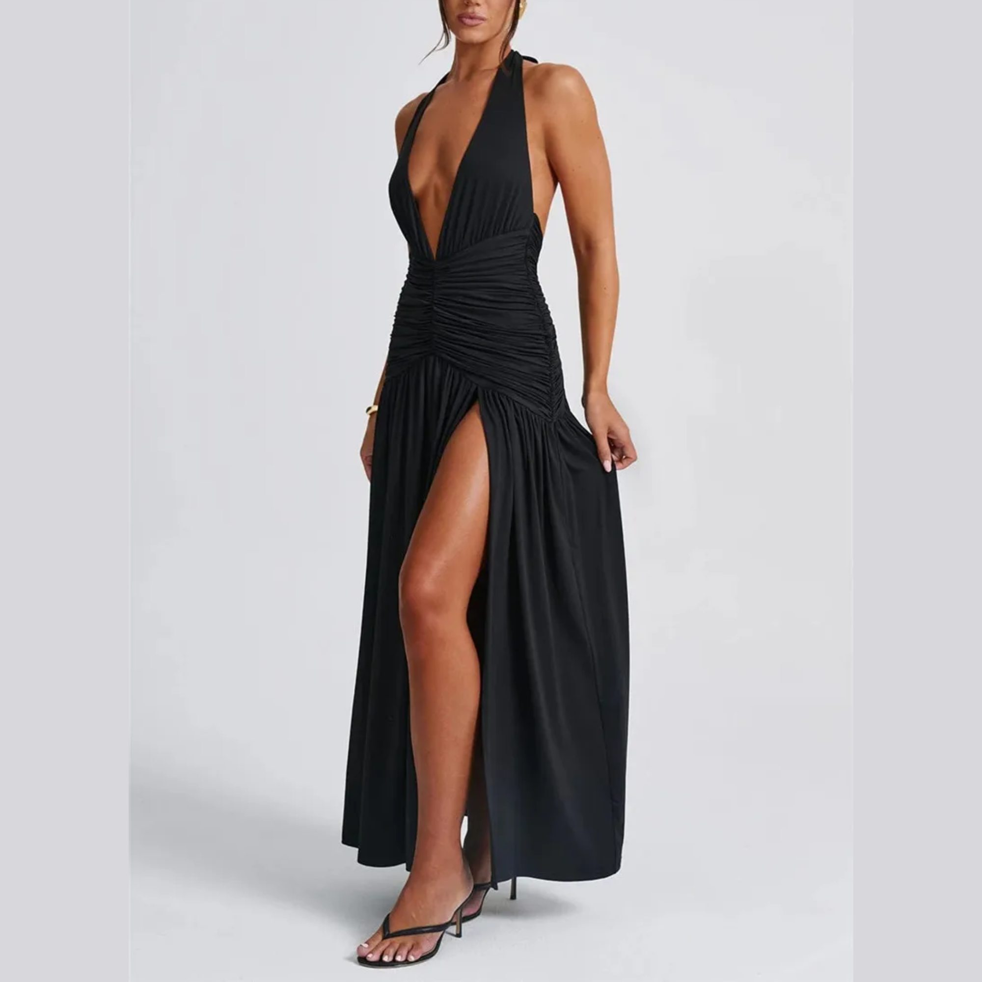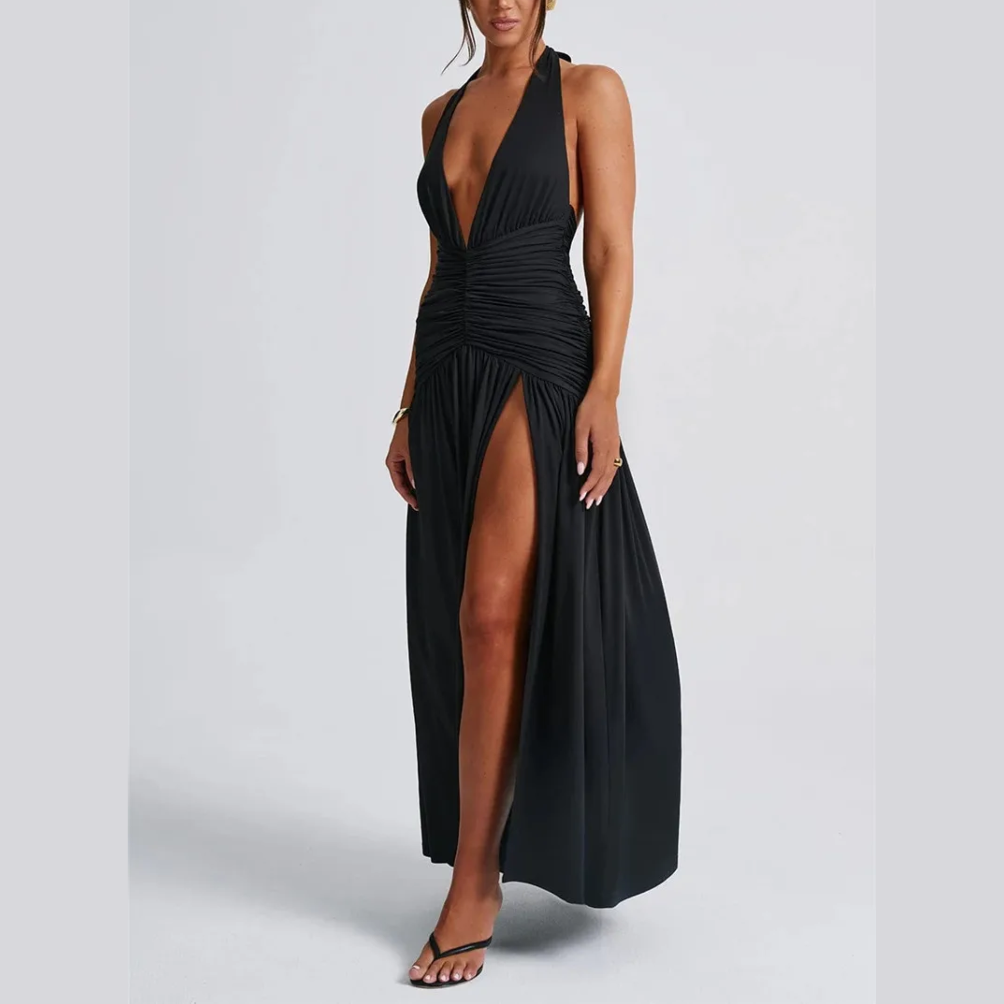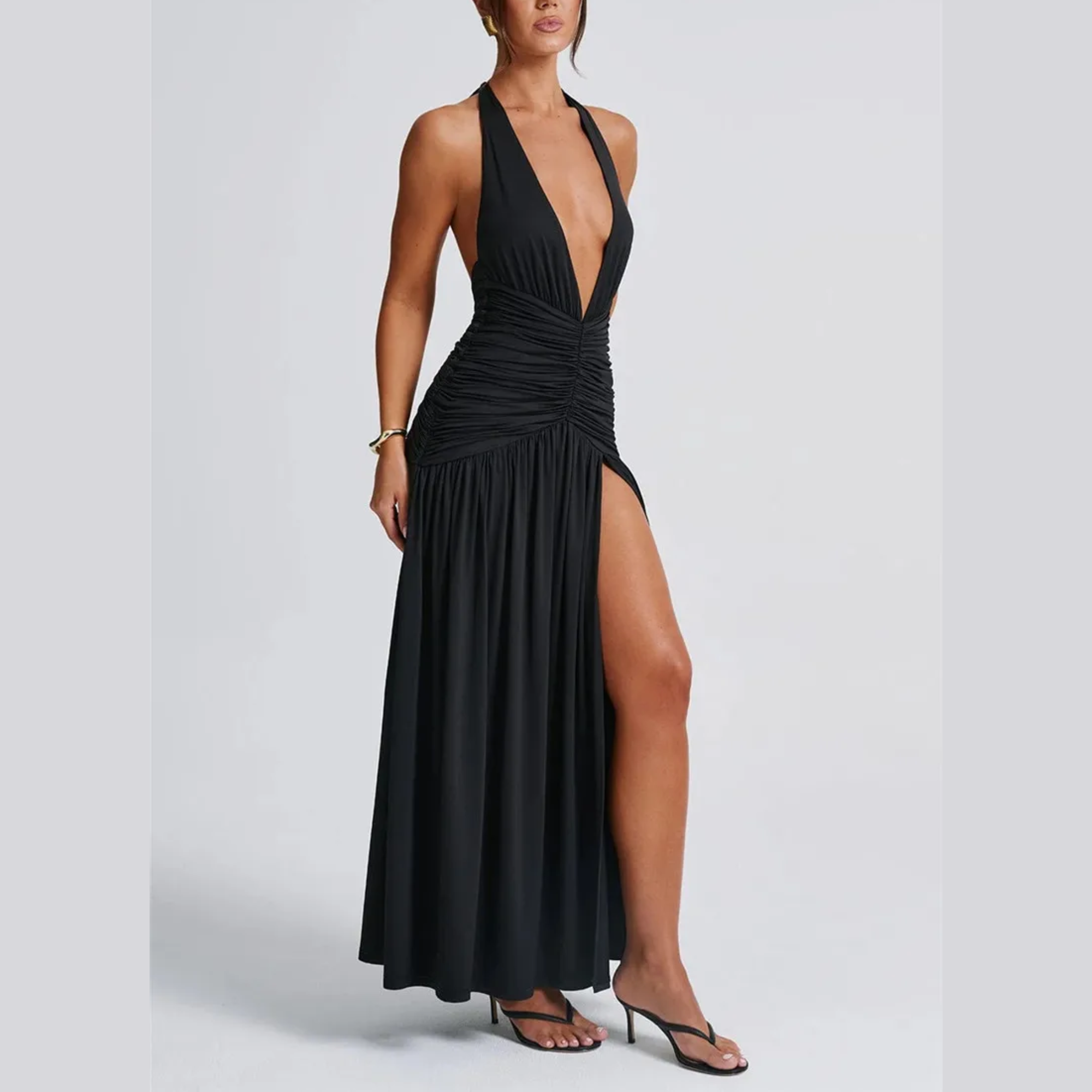 Vi presenterar det ultimata inom elegant aftonklädsel – en fängslande maxiklänning som utstrålar självförtroende och stil. Designad med en sensuell djup V-ringning med halterneck och öppen rygg, garanterar denna klänning en oförglömlig entré. Den lårhöga slitsen framtill förstärker den glamorösa känslan och låter dig visa upp dina ben samtidigt som du rör dig med elegans. Perfekt för bröllop, baler eller en utekväll på stan, kombinerar denna klänning sofistikering med en touch av förförelse.