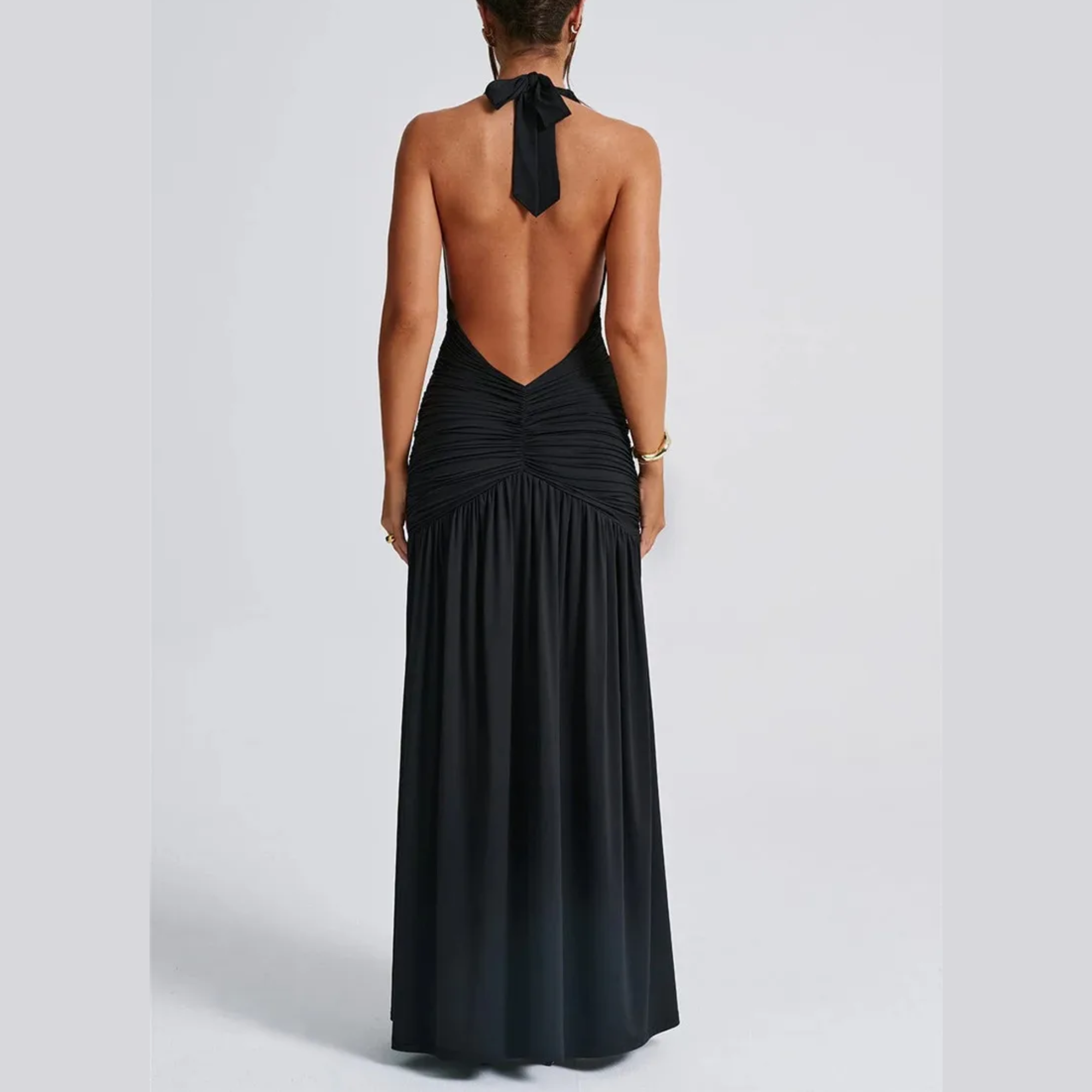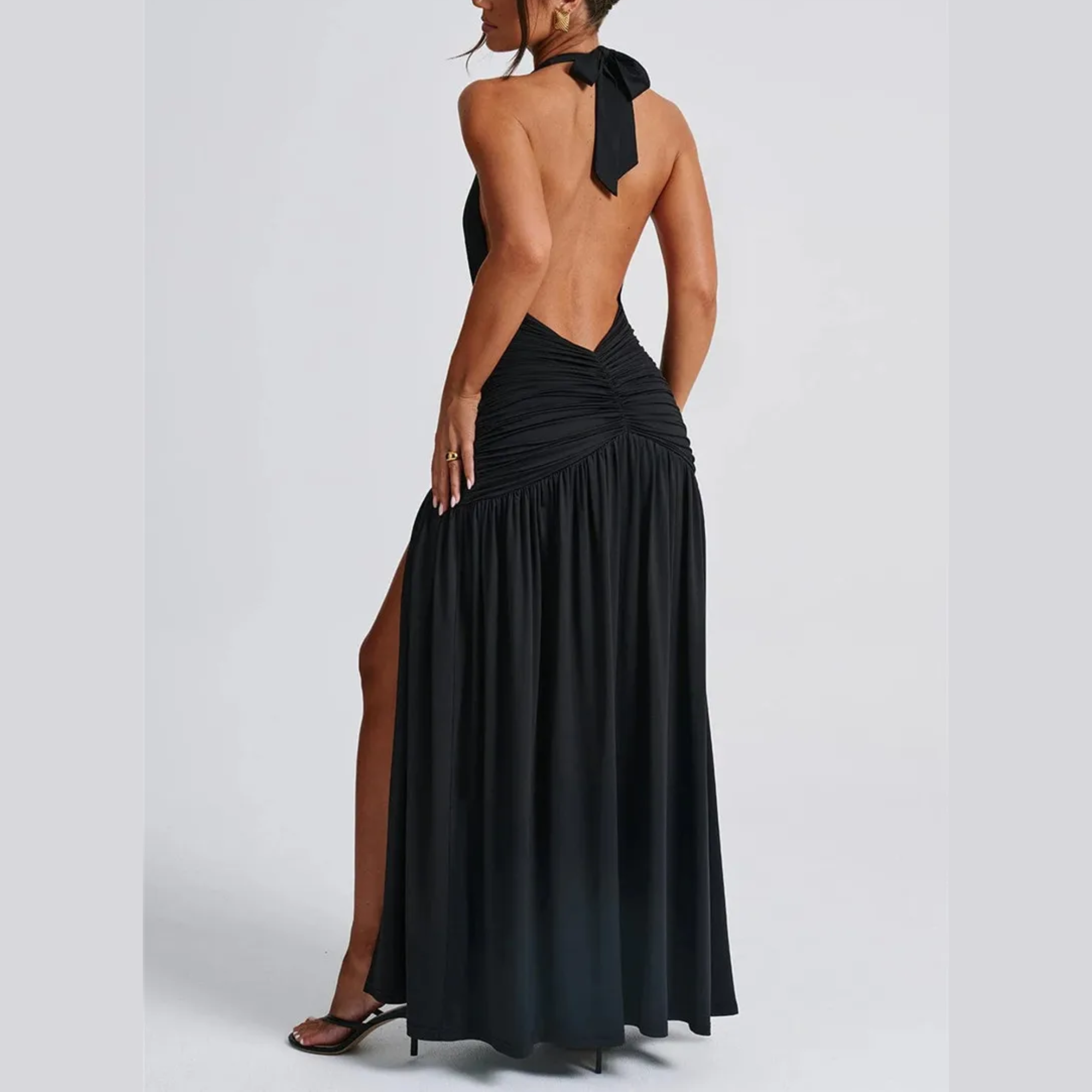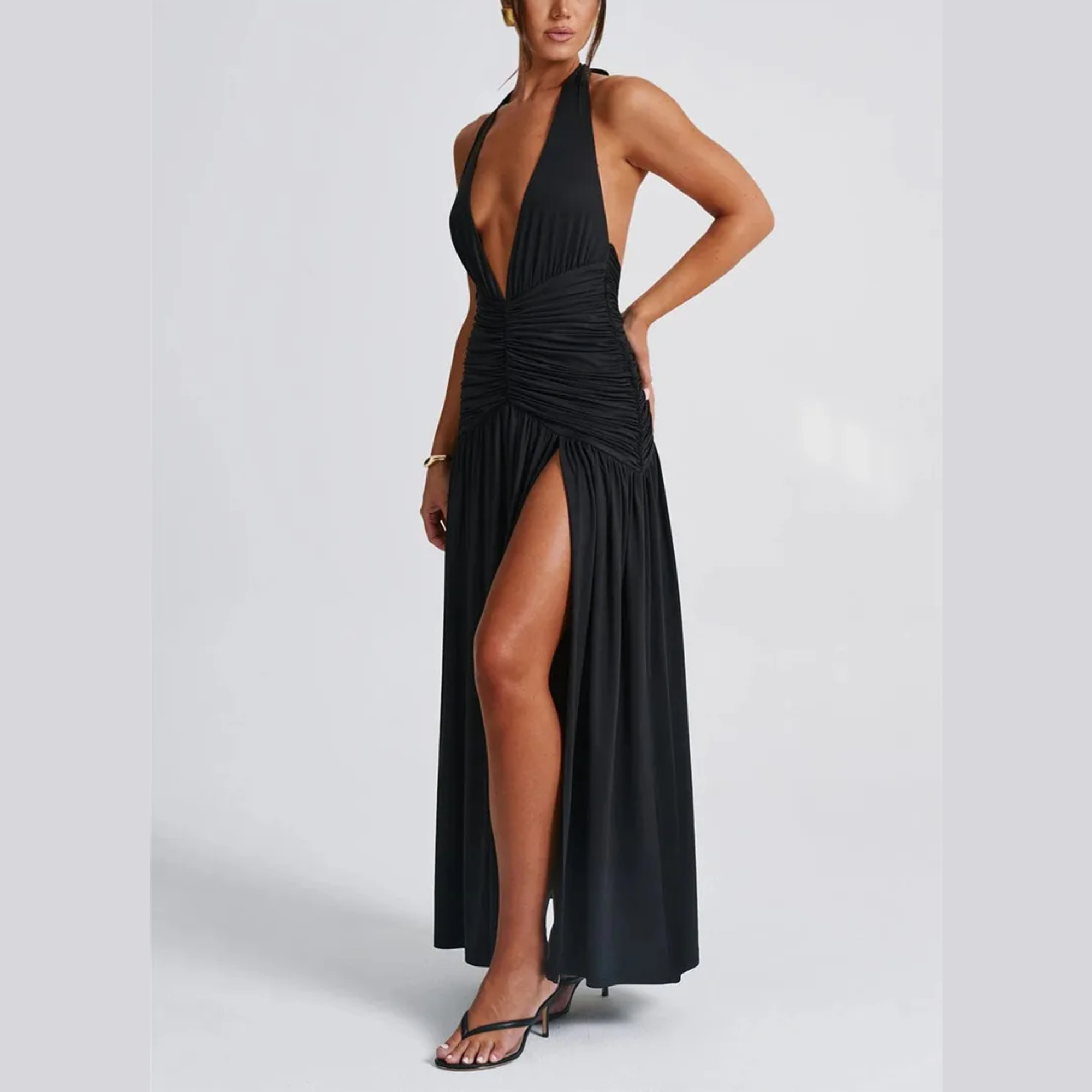 Vi presenterar det ultimata inom elegant aftonklädsel – en fängslande maxiklänning som utstrålar självförtroende och stil. Designad med en sensuell djup V-ringning med halterneck och öppen rygg, garanterar denna klänning en oförglömlig entré. Den lårhöga slitsen framtill förstärker den glamorösa känslan och låter dig visa upp dina ben samtidigt som du rör dig med elegans. Perfekt för bröllop, baler eller en utekväll på stan, kombinerar denna klänning sofistikering med en touch av förförelse.