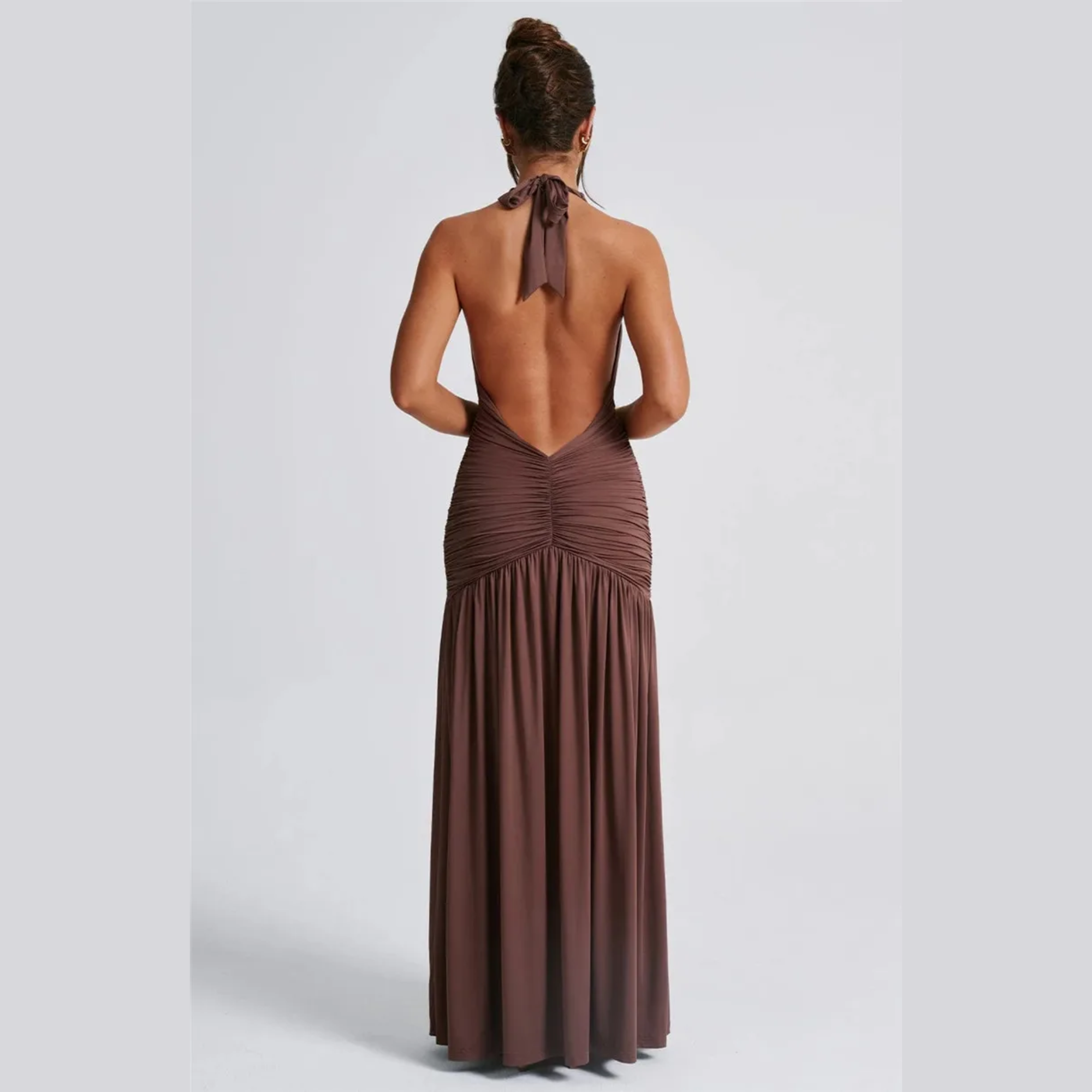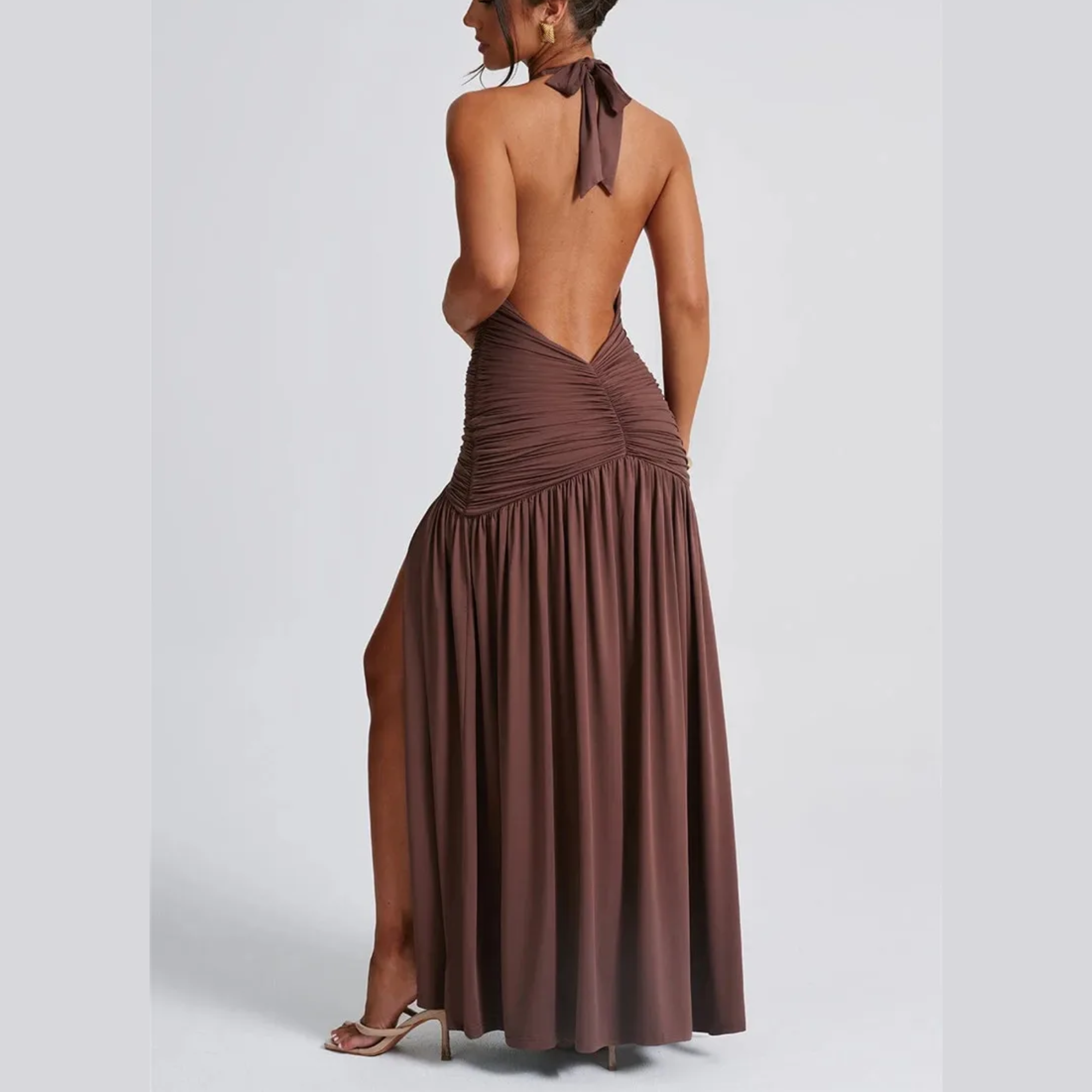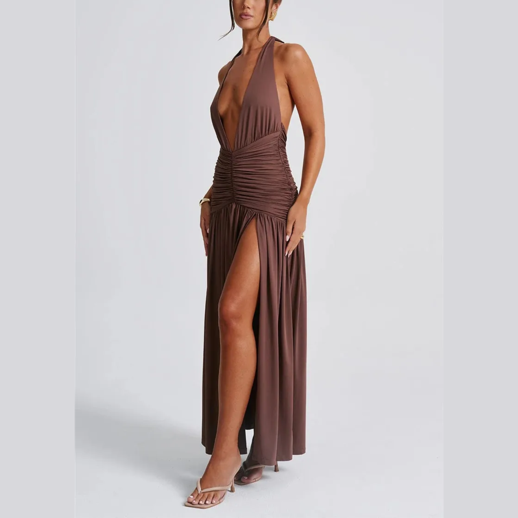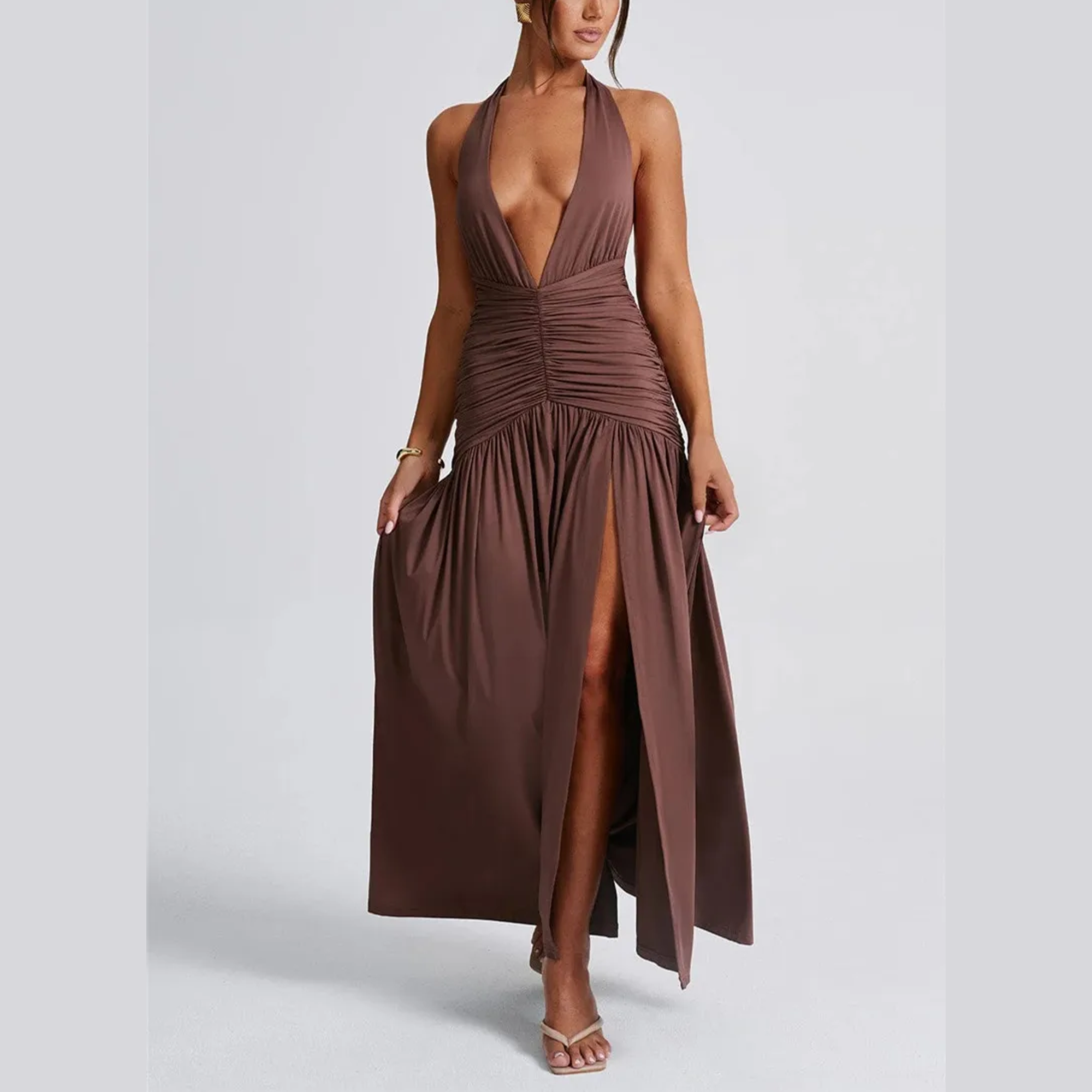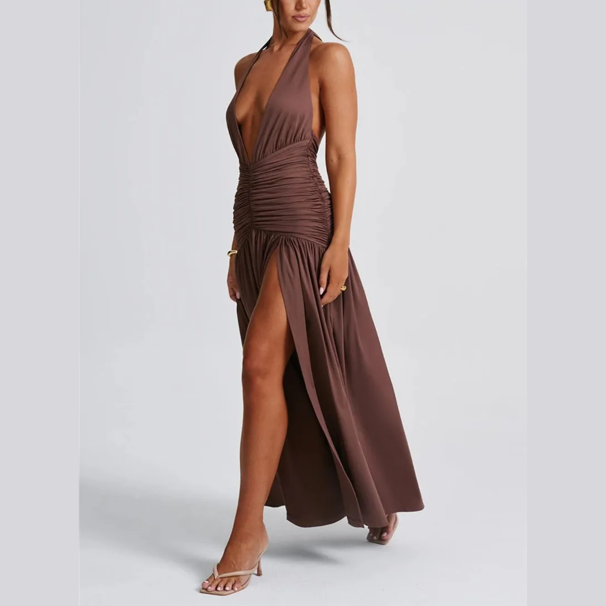 Vi presenterar det ultimata inom elegant aftonklädsel – en fängslande maxiklänning som utstrålar självförtroende och stil. Designad med en sensuell djup V-ringning med halterneck och öppen rygg, garanterar denna klänning en oförglömlig entré. Den lårhöga slitsen framtill förstärker den glamorösa känslan och låter dig visa upp dina ben samtidigt som du rör dig med elegans. Perfekt för bröllop, baler eller en utekväll på stan, kombinerar denna klänning sofistikering med en touch av förförelse.